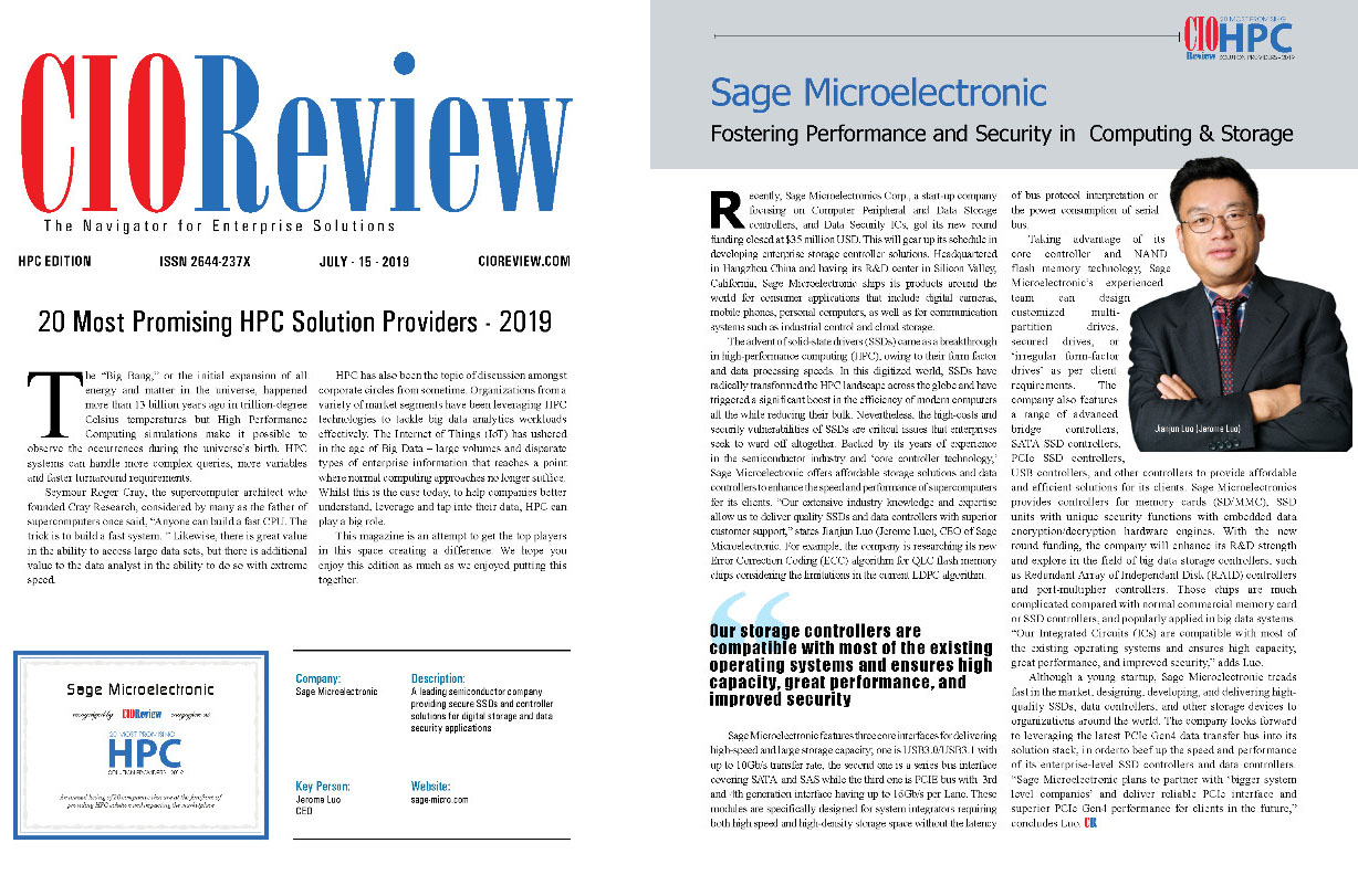 7月15日,美國媒體CIOREVIEW公布2019年20個最有潛力HPC解決方案供應商名單,中國大陸企業華瀾微電子股份有限公司(Sage Microelectronic Corp)入選。這是繼2017年浪潮入選之后,中國大陸企業再一次登榜。